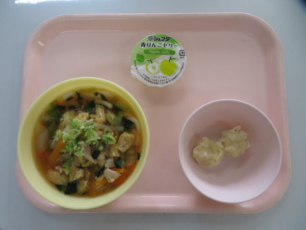 今日の給食は、肉野菜うどん・えびしゅうまい・フルーツゼリーです。