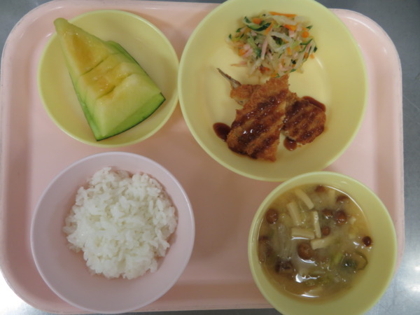 今日の献立は、ごはん・みそ汁・あじフライ・切干大根のサラダ・メロンです。