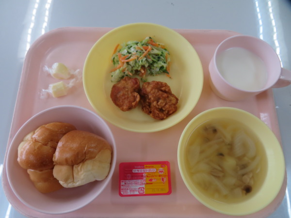 7月15日(土)の給食は、ロールパン・ポテトスープ・唐揚げ・コールスローサラダ・キャンディチーズ・牛乳です。