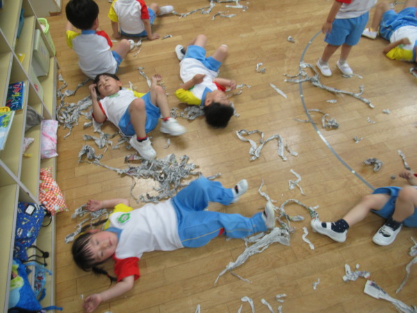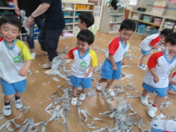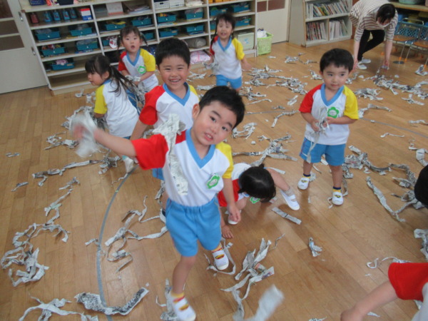 お部屋で新聞プールをして遊びました。ビリビリに割いた新聞を友達や先生とかけ合いっこして、大はしゃぎの子ども達です!