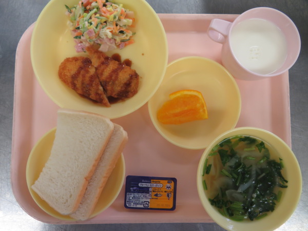 今日の献立は、食パン・ブルーベリー&マーガリン・コンソメスープ・白身魚フライ・白菜サラダ・オレンジ・牛乳です。