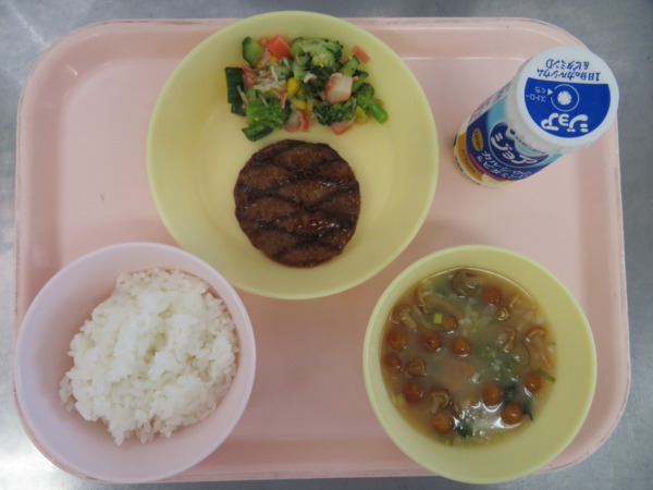 今日の給食は、ごはん・具だくさんみそ汁・網焼きハンバーグ・かにかまサラダ・ジョアです。
