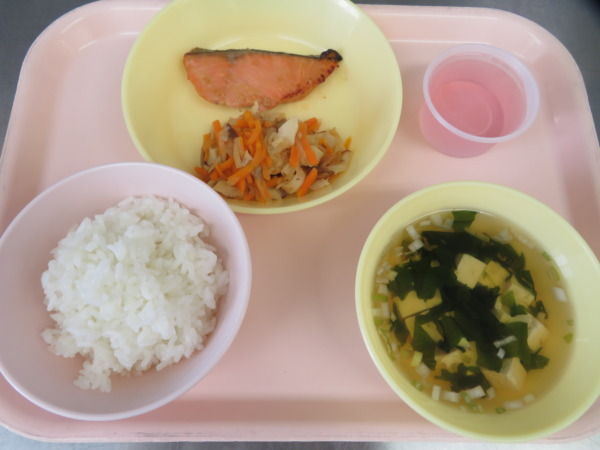 今日の給食は、ごはん・みそ汁・鮭の西京漬け焼き・切干大根煮・ももゼリーです。