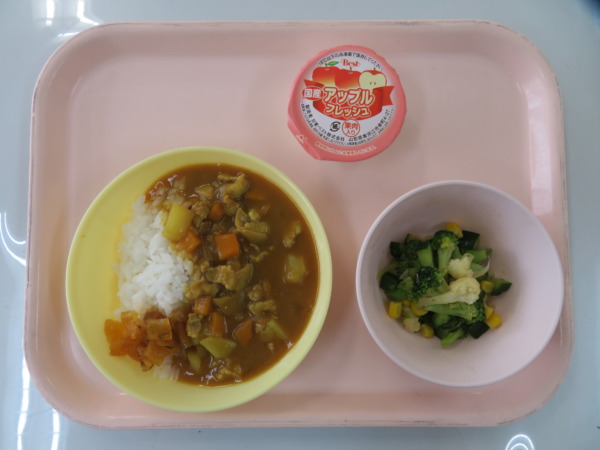 今日の給食は、ポークカレー・花野菜サラダ・フルーツゼリーです。