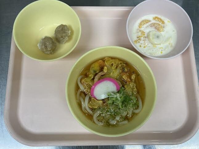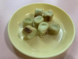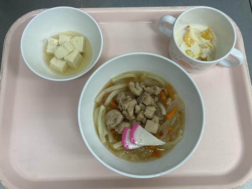 かき揚げうどん 【幼児食】 かきあげうどん・しゅうまい・フルーツヨーグルトです。 【完了食】 鶏野菜うどん・煮奴・フルーツヨーグルトです。 今日のおやつは、1歳児さんお麩ラスク 2歳以上児さんはミニパイです。
