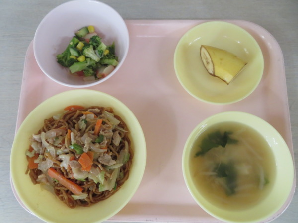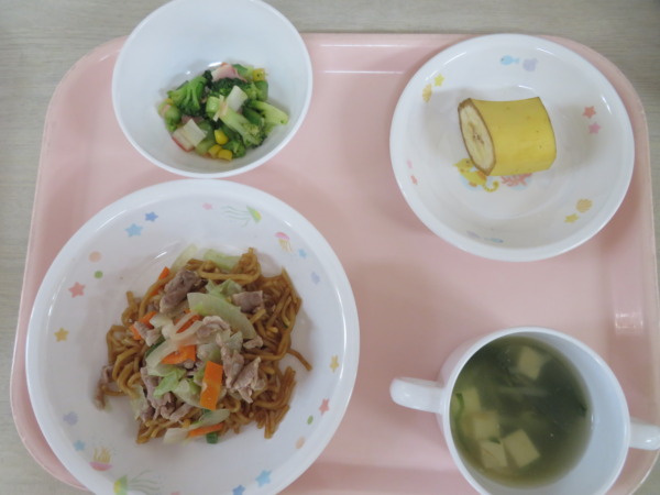 焼きそば・中華スープ・かにかまサラダ・バナナです。