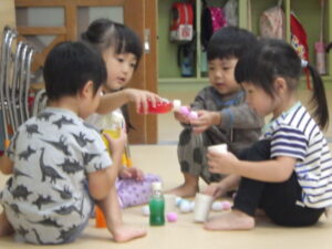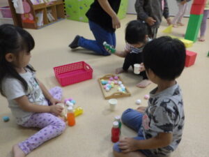 お部屋では、ジュースごっこが、盛り上がっています♪好きな色のジュースをお友達に注ぐ真似をしたり、みんなで飲む真似っこをしたりして、楽しんでいますよ♪