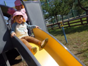晴れている日は、園庭で遊んでいます。黄色や茶色のきれいな落ち葉を見つけると「見て、葉っぱ、あったよ♪」「こっちにもあるよ!」と探索を楽しんでいます🍂