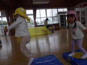 ホールでは、友達と一緒に、トンネルをしたり、トランポリンをしたりして、体をいっぱい動かして楽しんでいますよ!