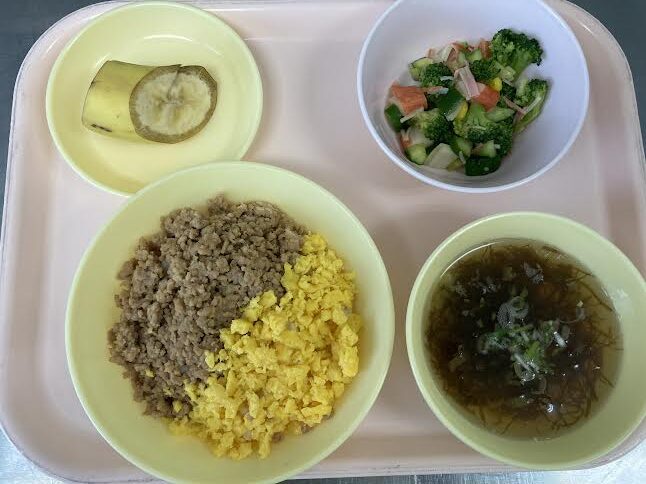今日の給食は、二色丼・もずくスープ・かにかまサラダ・バナナです。