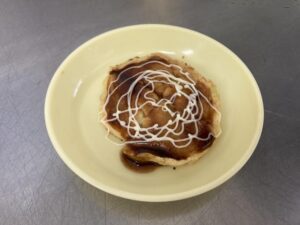 さばの塩焼き 【幼児食】 ごはん・みそ汁・さばの塩焼き・もやしの中華風和え物・ももゼリーです。 【完了食】 ごはん・みそ汁・鮭の甘塩焼き・もやしの中華風和え物・バナナです。 午後の1・2歳児さんのおやつは、ミニお好み焼きです。