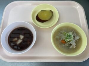給食室では、つきたてのお餅のおしること、やきいも、豚汁を作りました。
