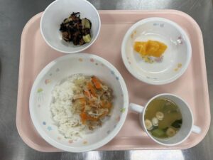 豚丼・みそ汁・ひじきの煮物・オレンジゼリーです。