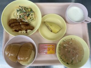 ロールパン・新玉ねぎのスープ・ささみチーズフライ・スパゲティサラダ・バナナ・牛乳です。