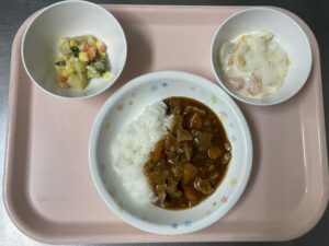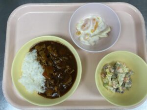 今日の給食は、ハヤシライス・コロコロサラダ・フルーツヨーグルトです。