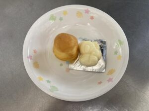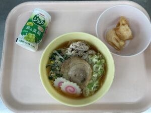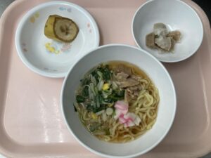 しょうゆラーメン 【以上児さん】 しょうゆラーメン・えびの揚げぎょうざ・ジョアです。 【未満児さん】 しょうゆラーメン・しゅうまい・バナナです。 午後の未満児さんのおやつは、りんごのプチケーキ・型抜きチーズです。