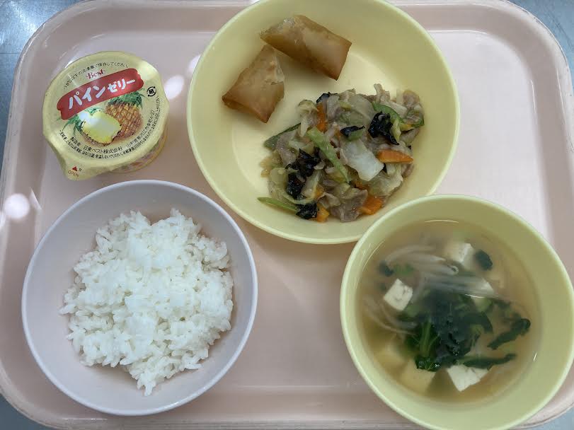 ごはん・とうふスープ・八宝菜・春巻き・パインゼリーです。