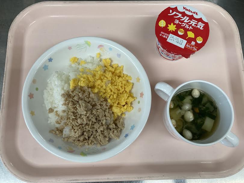 今日の給食は、二色丼・具沢山みそ汁・フルーツゼリー(未満児さんはヨーグルト)です。