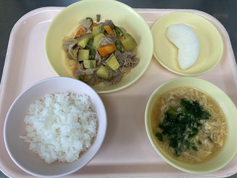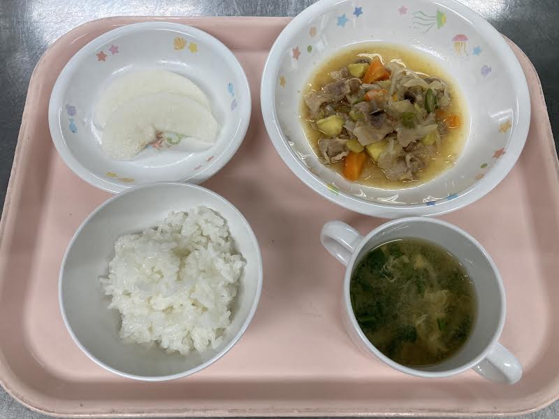 ごはん・かきたま汁・秋野菜と豚肉の煮物・梨です。