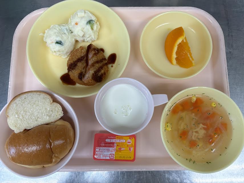 ロールパン・ABCスープ・ポークハムカツ・ポテチーサラダ・オレンジ・牛乳です。