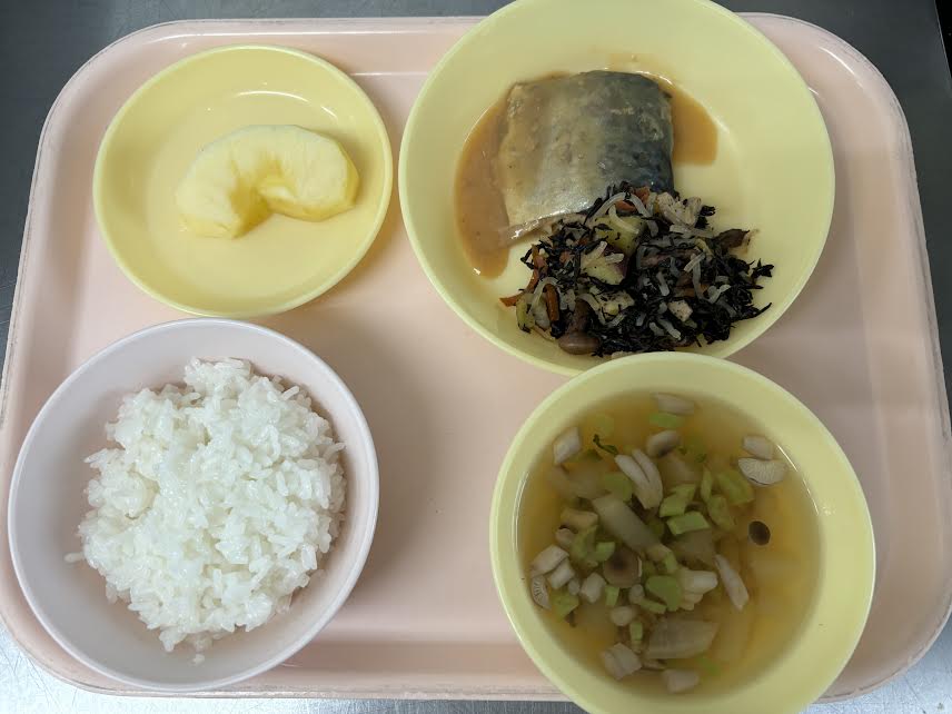 今日の給食は、ごはん・大根としめじのすまし汁・さばのみそ煮(未満児さんは赤魚)・ひじきの煮物・りんごです。