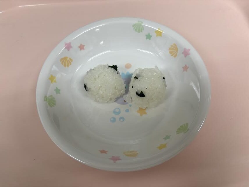 未満児さんの午後のおやつは、わかめおにぎりです。