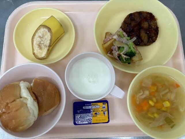 ロールパン・野菜スープ・網焼きハンバーグ・ジャーマンポテト・バナナ・牛乳です。