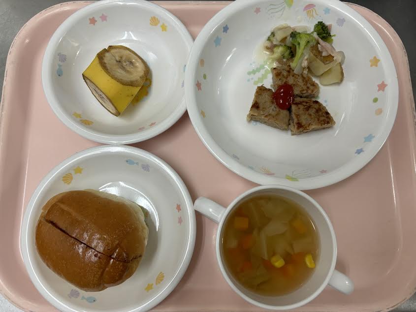 ロールパン・野菜スープ・ハンバーグ・ジャーマンポテト・バナナです。