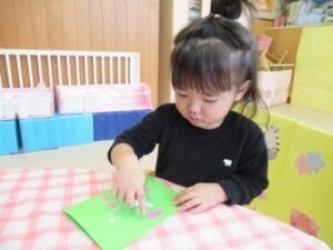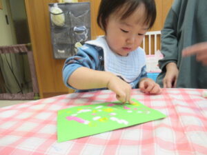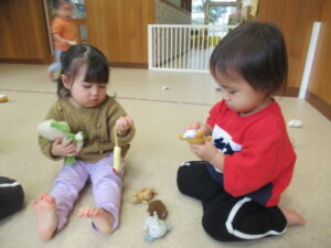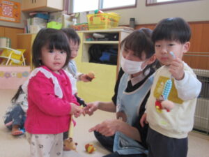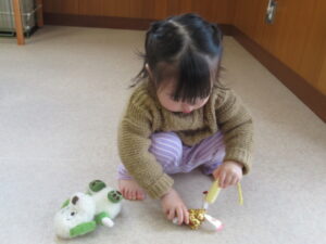 最近のひよこ組さんたちは、トイレにも興味津々。「出る~」と教えて成功するお友達もいて、お伴したいお友達が増えています。本格的なトイレトレーニングに繋がるように、子ども達のやる気を応援していきたいと思っています。