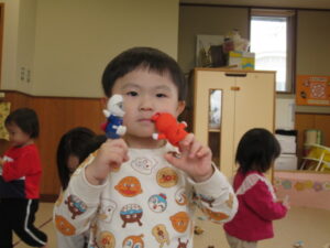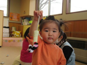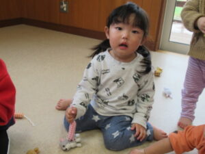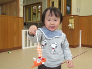 この日は、大好きなキャラクターや動物のマスコットを釣って遊びました。指先に神経を集中させて、狙ったマスコットを釣り上げます!最初はなかなかうまく釣り上げることができなかったひよこ組さんたちですが、コツをつかむと上手に釣り上げ、笑顔&ドヤ顔😊楽しい釣り遊びになりました。