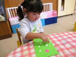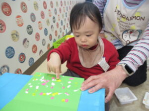 クリスマスに向けて、製作も始めました🎄4色の絵の具を使って、『デカルコマニー』に初挑戦!!指先で絵の具をチョンチョンつけたら、紙を半分に折ってこすります。