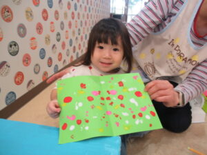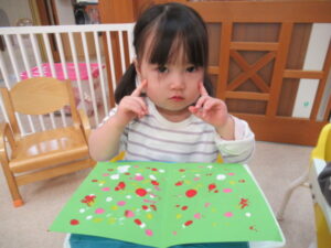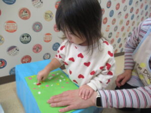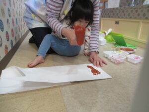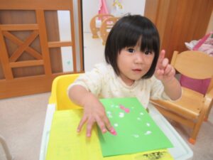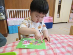 紙を広げると・・・あら不思議✨模様が転写されました。紙を広げた時の不思議そうな嬉しそうな表情が、可愛かったです。足形は何になるのかな?ひよこ組さんは、「うし」と言っていましたが、これから仕上げ作業。完成を楽しみにもうひと頑張りしようね🎵