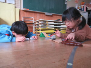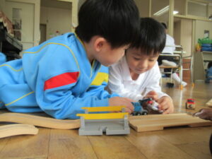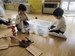 電車のレールをつなげています!横から見ながら、坂道の高さを確認中!