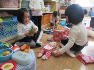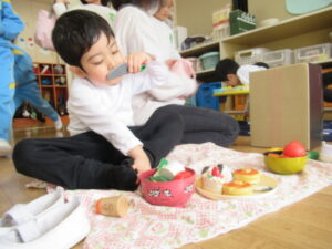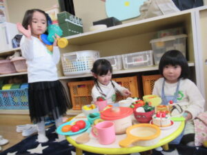 おままごとでは、友達とテーブルにたくさん並べたり、お鍋で料理をしたりしています。