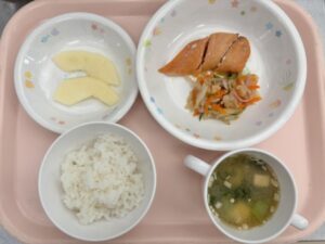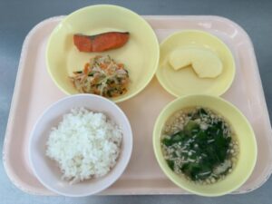 今日の給食は、ごはん・小松菜のみそ汁・鮭の塩焼き・切り干し大根サラダ・りんごです。